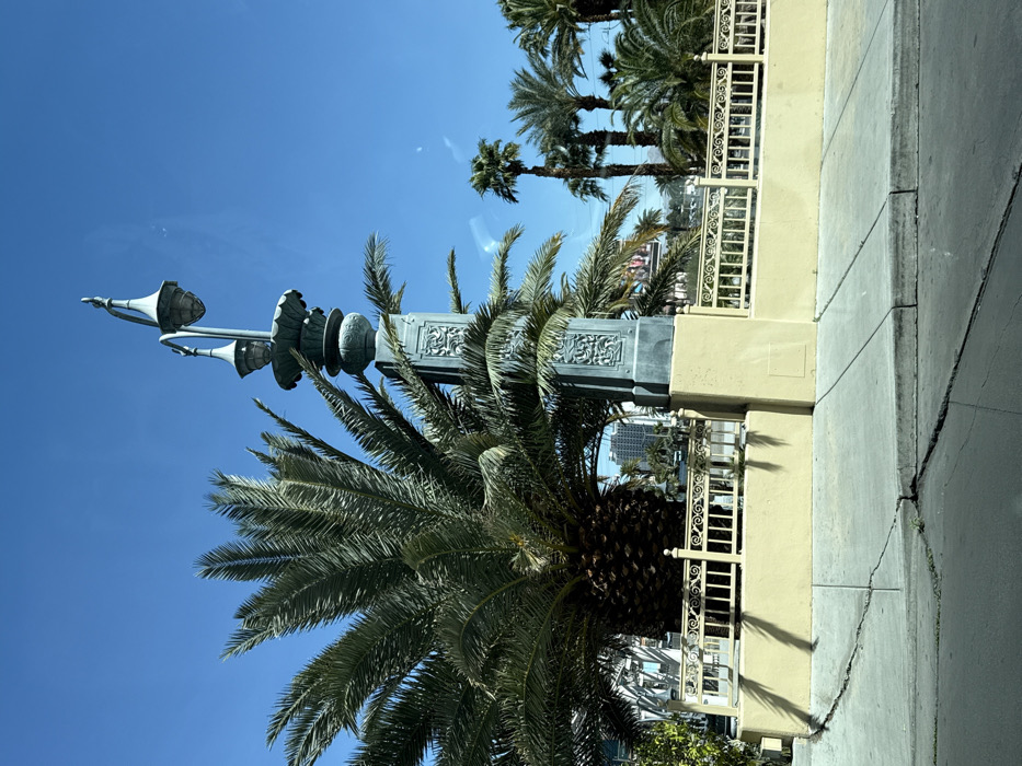 This image depicts a sunny outdoor scene on the Las Vegas Strip, Las Vegas, Nevada, United States of America. The foreground features a dark asphalt road surface with a visible horizontal crack, leading to a concrete sidewalk with expansion joints and minor cracks where small weeds emerge. A beige-colored stucco or concrete retaining wall runs along the sidewalk, topped by a decorative yellow-gold metal railing with scrollwork. Dominating the midground is a tall, ornate streetlamp with a dark, possibly bronzed finish. Its base is substantial and features carved or molded relief panels. The upper section is urn-shaped, supporting two curved arms from which hang bell-shaped, downward-facing light fixtures with protective grates. To the left of the lamppost, a large, mature palm tree with a thick, textured trunk and dense canopy of green fronds partially obscures the lower lamppost and railing. Additional palm trees of various heights are visible behind the primary palm and lamppost, extending into the background. The background reveals blurred, multi-story buildings characteristic of resorts or hotels, along with a partially visible large billboard. The sky is clear and bright blue, indicating direct sunlight which casts distinct shadows from the railing and lamppost onto the wall. No individuals, vehicles, or specific actions are discernible.