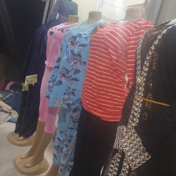 The image displays an indoor retail scene in Dan Maliki, Nigeria, featuring five headless mannequins arranged diagonally from left to right. The first mannequin, partially visible on the far left, wears a dark blue garment with gold fringed trim. The second mannequin wears a pink long-sleeved top featuring white lettering, possibly "CIA," paired with pink capri leggings. The third mannequin showcases a light blue two-piece ensemble with a floral pattern and a lace-trimmed neckline. The fourth mannequin displays a red and white horizontally striped long-sleeved top combined with black leggings. The fifth mannequin, partially visible on the far right, wears a black long dress or abaya adorned with intricate white and gold patterned embellishments and a thin yellow string tied at the waist. All visible mannequins are light brown in coloration, include hands and feet, and rest on rounded, light brown display bases. The background is out of focus, revealing blurred textiles and a light-colored wall with a white sign.