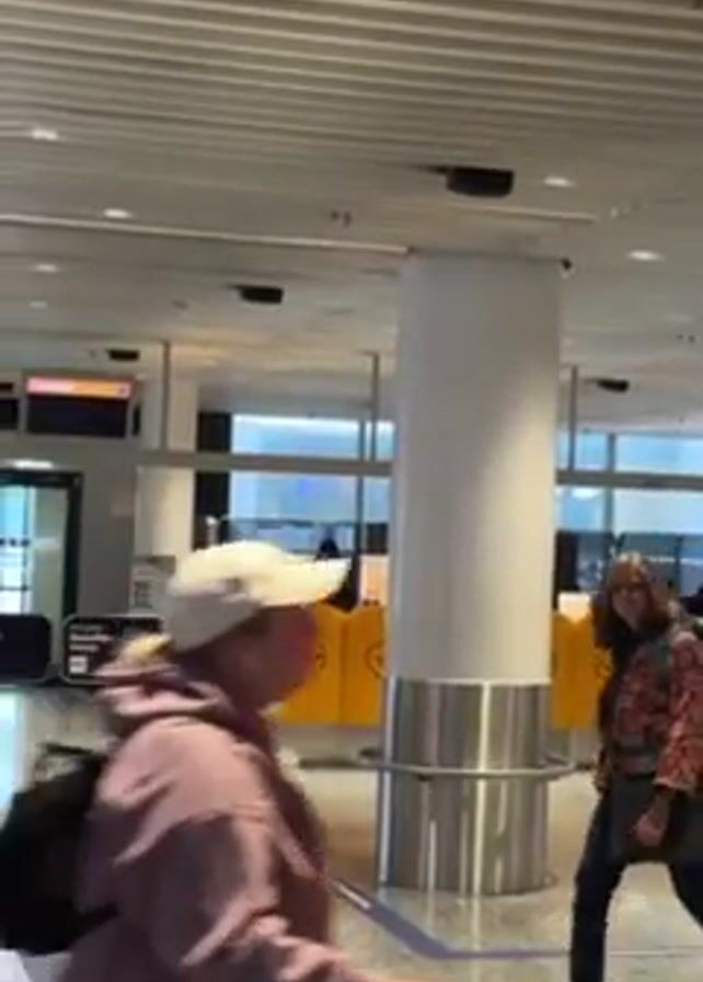 interior of an airport, likely a terminal or waiting area. There are people walking and sitting, some using their phones or reading. Lufthansa check-in desks are visible in the first shot, followed by automated gate access and signs indicating the direction to gates A20. There are also architectural elements such as support columns and ceiling structures. The overall impression is of a modern and busy airport environment.
