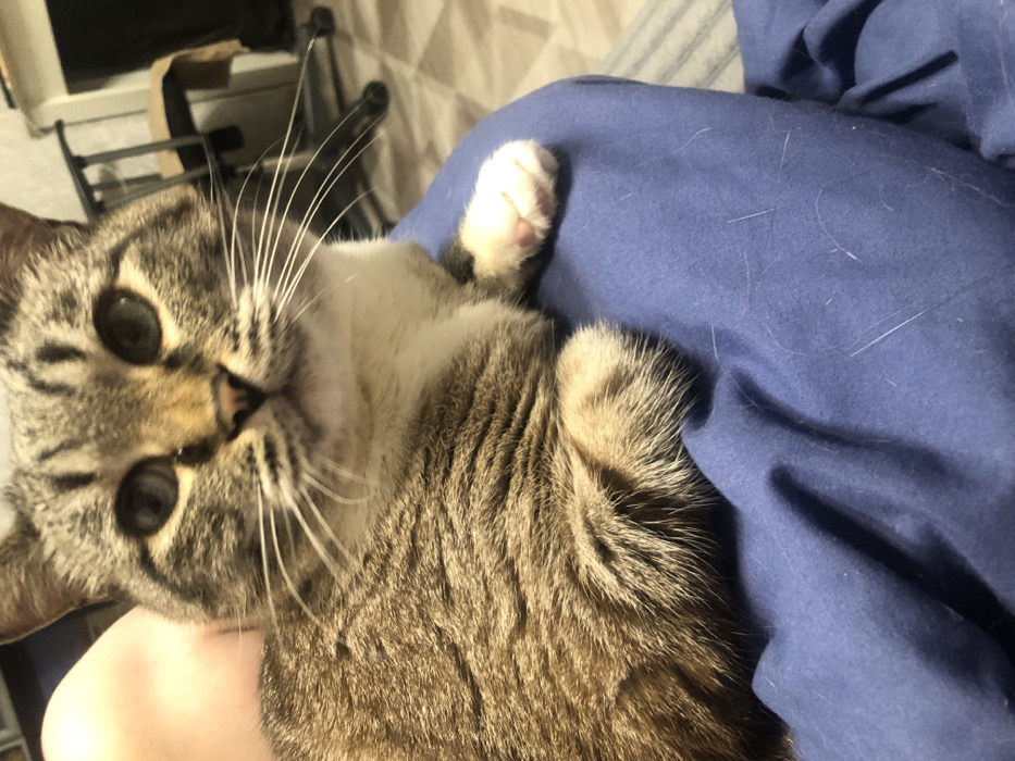 A domestic cat, a tabby with brown, grey, and black striped fur and a white chest, sits facing forward. Its eyes are light-colored, and prominent white whiskers are visible. A small dark mark is present below its left eye. The cat's front right paw, displaying pink pads, rests on a dark blue fabric surface, which is covered with numerous light-colored cat hairs. This fabric is draped over a human limb, a portion of which, showing light skin, is visible in the upper left of the frame. The background is an indoor, out-of-focus environment, revealing parts of a dark office chair with metal components on the right, and a light-colored floor or rug with a subtle striped pattern. The scene is located within a residential setting in the city of Chaikovsky, Russia.