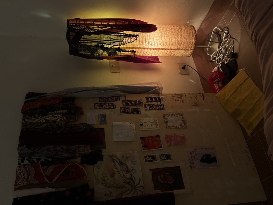 A dimly lit room features a table adorned with various objects, including stacked fabrics, strips of photos, handwritten notes, postcards, and a book. A lampshade decorated with fabric hangs above, casting a warm glow. Cords from the lamp trail down the wall to an outlet. A yellow bag and a red box are visible on the floor, next to a section of a bed. The overall impression is one of a cluttered, but personalized and intimate space.