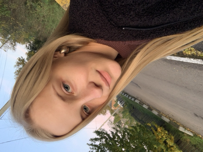 The image depicts a young blonde female, appearing to be in her late teens or early twenties, posing for a photograph outdoors in the city of Bohuslav, Ukraine