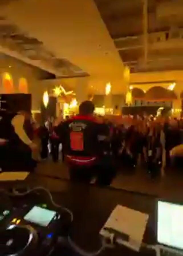 DJ at a party. The DJ is operating a Pioneer DJ set and an Akai Professional MPK Mini MK3 midi keyboard. A laptop is visible on the DJ table. The party has a crowd of people dancing, including a person in a hockey jersey with the number 06 on the back. Decorations that appear to be star shaped are hanging from the ceiling. The lighting is warm.