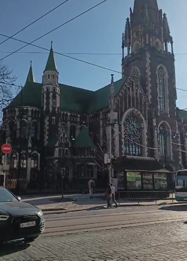 low-angle, panning shot of a large, Gothic-style church in a city. The church has a green roof, tall spires, and intricate architectural details. A black car is parked on the street in front of the church. A bus drives by in the background. Several people are walking on the sidewalk near the church. The sky is clear and blue, and the sun is shining brightly. The street is paved with cobblestones. Power lines stretch across the sky.
