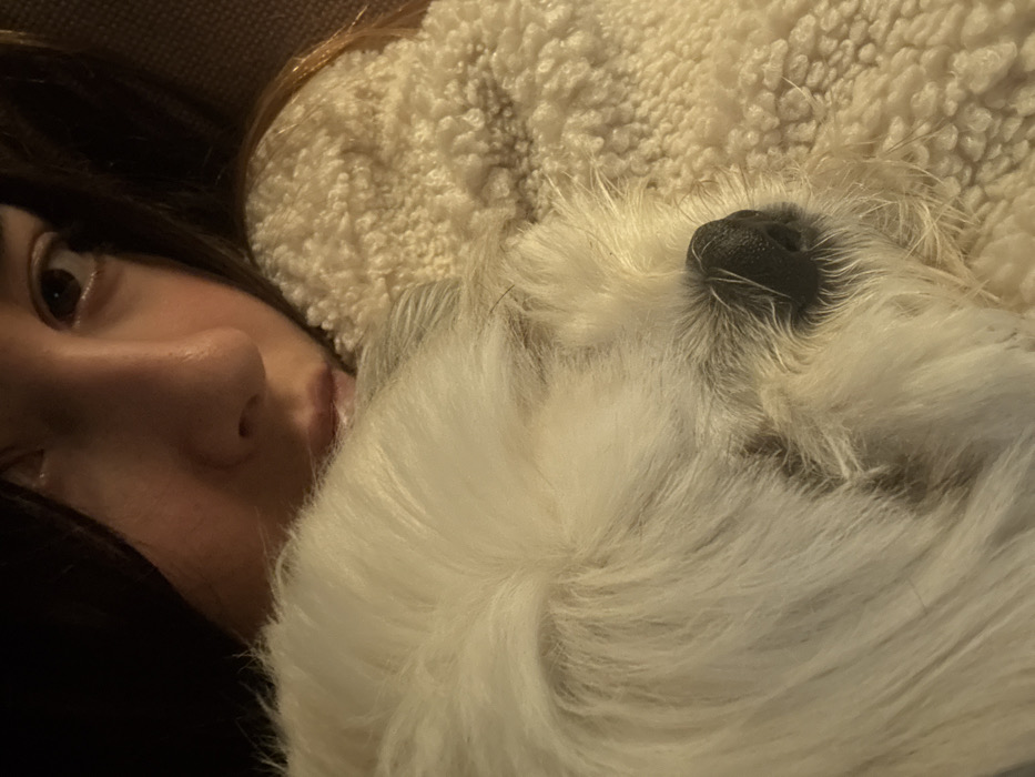 The image displays a close-up, indoor scene under dim lighting. A human face, partially visible in the upper-right quadrant, shows the right eye, nose, and lips of an individual with dark hair and light skin tone. The individual's expression is neutral. Dominating the lower-left and central frame is a small, white, long-haired dog, its head resting. The dog exhibits fluffy white fur, a prominent black nose, and visible whiskers. Both the human and the dog are nestled against a cream-colored, textured, fleece-like material. The interaction suggests close physical proximity and comfort between the two subjects. No specific details within the image allow for the determination of a precise location within Mexico City, Mexico, or any other geographical area.