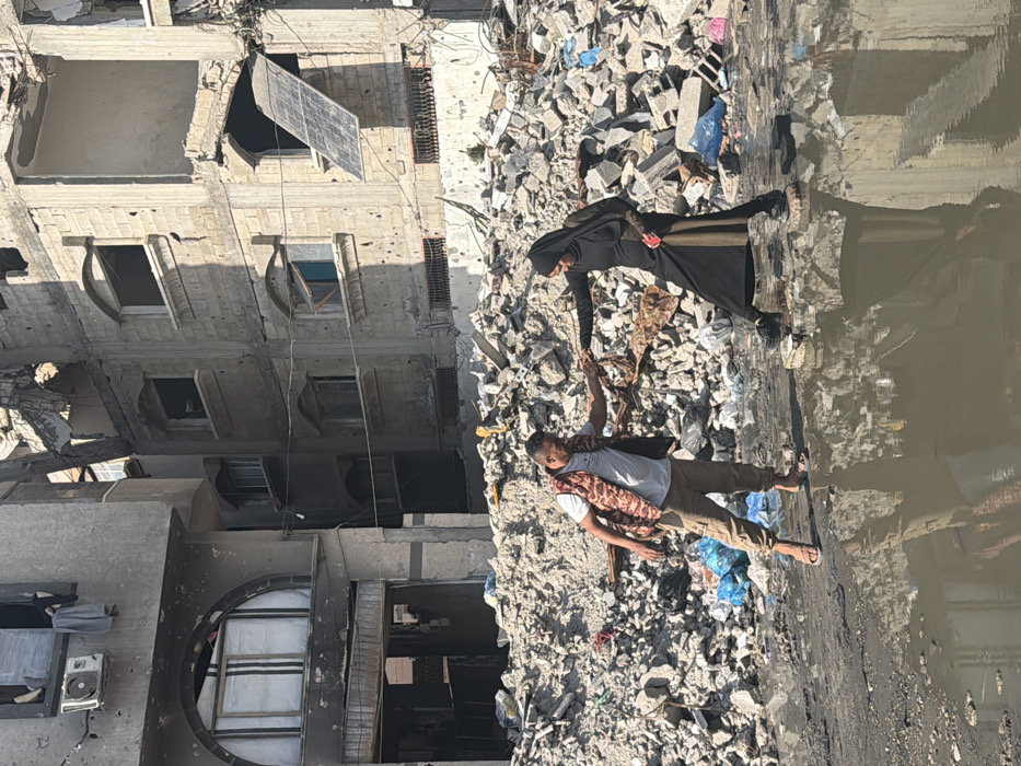 A woman in a black hijab and dress is assisting a man in khaki pants and a white t-shirt across a rubble-strewn area