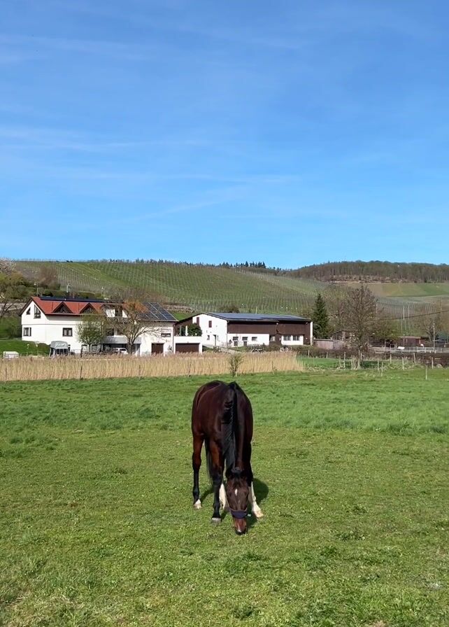 A brown horse is grazing in a green field under a clear blue sky. In the background are houses and a hillside covered in what appears to be vineyards. The horse is facing the camera, its head down eating grass. It has a blue halter on. The houses are mostly white with some having solar panels on the roofs. A small patch of reeds can be seen between the field and the houses. The sun is shining brightly.