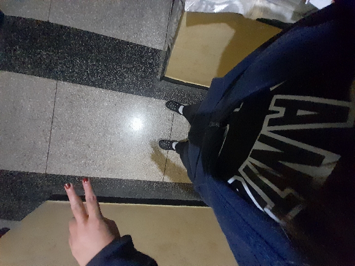 A person stands on a tiled floor, capturing a selfie from above. They are wearing black shoes, black pants, and a dark blue jacket over a black shirt with white lettering. Their left hand is visible, displaying a peace sign with red painted nails. The flooring has a pattern of alternating gray and black tiles. There are tan surfaces that appear to be the tops of tables or counters.