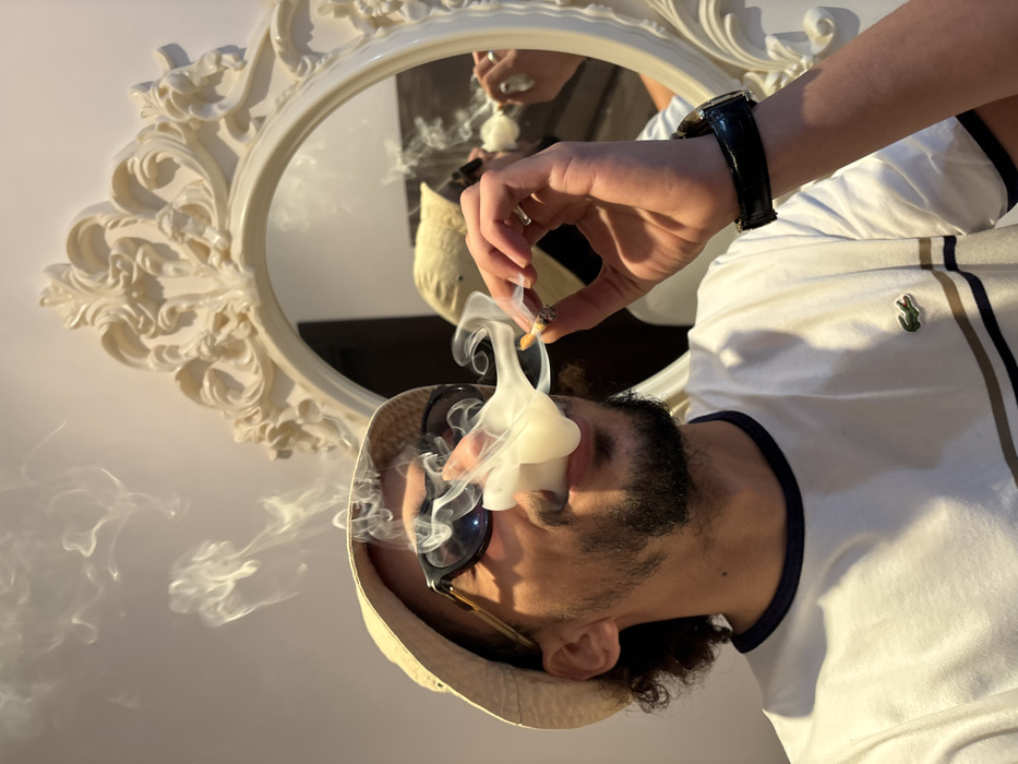 This image depicts a male individual indoors in M'Diq, Morocco, actively exhaling a shaped plume of smoke
