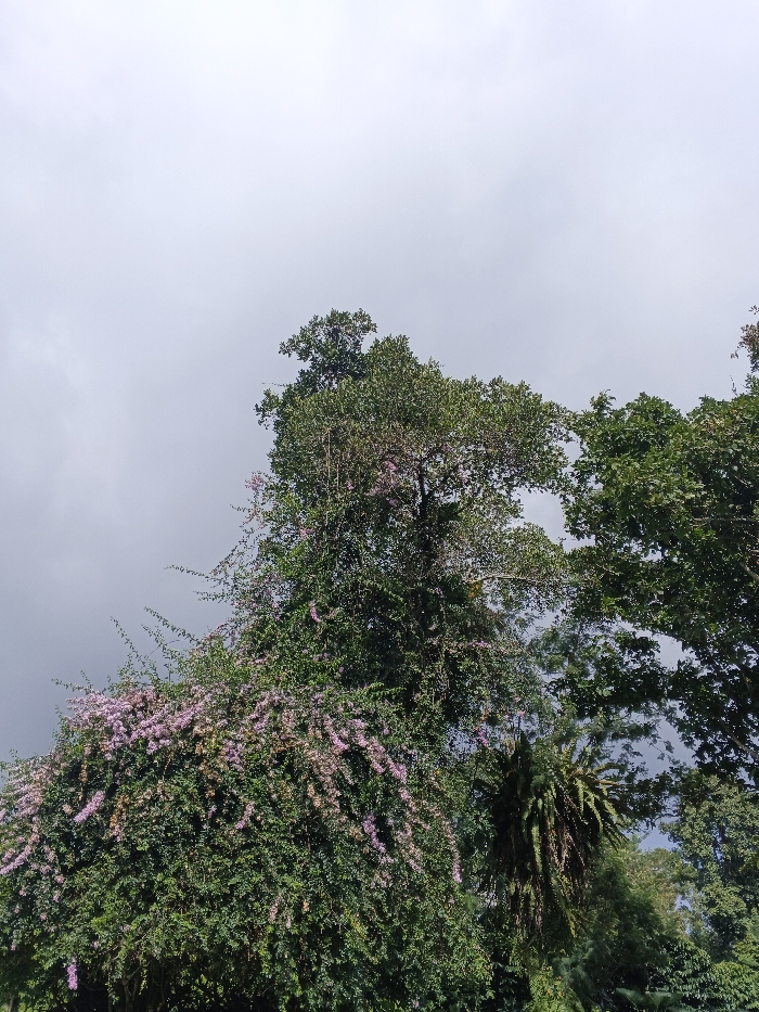 Lush greenery dominates, with a tall tree at the center, adorned with clusters of delicate purple flowers cascading down its left side. Another tree with darker green foliage stands to the right. A fern hangs amidst the lower foliage. Above, a cloudy, overcast sky fills the upper portion of the frame, casting a soft, diffused light on the scene. The overall impression is one of a verdant, tropical environment.