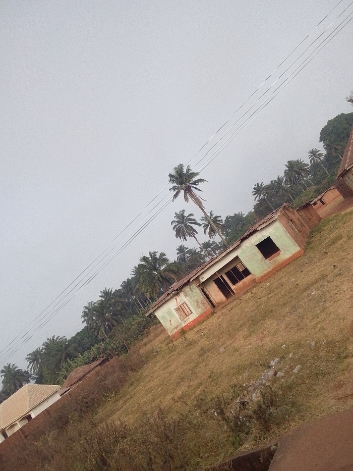 The image depicts an outdoor, static scene within Emabo, Nigeria, under an overcast, light grey sky. The environment consists of a dry, brownish-yellow grassy slope occupying the foreground and midground, interspersed with patches of darker vegetation. A dilapidated, single-story building, painted in faded light green with a reddish-brown lower section and a rusted corrugated metal roof, stands prominently on the slope in the midground. This structure features several window openings, some empty, others fitted with wooden frames, and a visible doorway opening. Partially visible to the right and slightly behind this building is another structure with reddish-brown walls. In the lower-left, a section of a more modern, lighter-colored building with a tan tiled roof is present. The background is characterized by a dense growth of numerous palm trees covering a rising landform. Multiple parallel utility lines stretch diagonally across the upper portion of the frame. No individuals are present, and no discernible actions or interactions are taking place. Scattered light-colored debris is visible on the ground to the right of the dilapidated building.