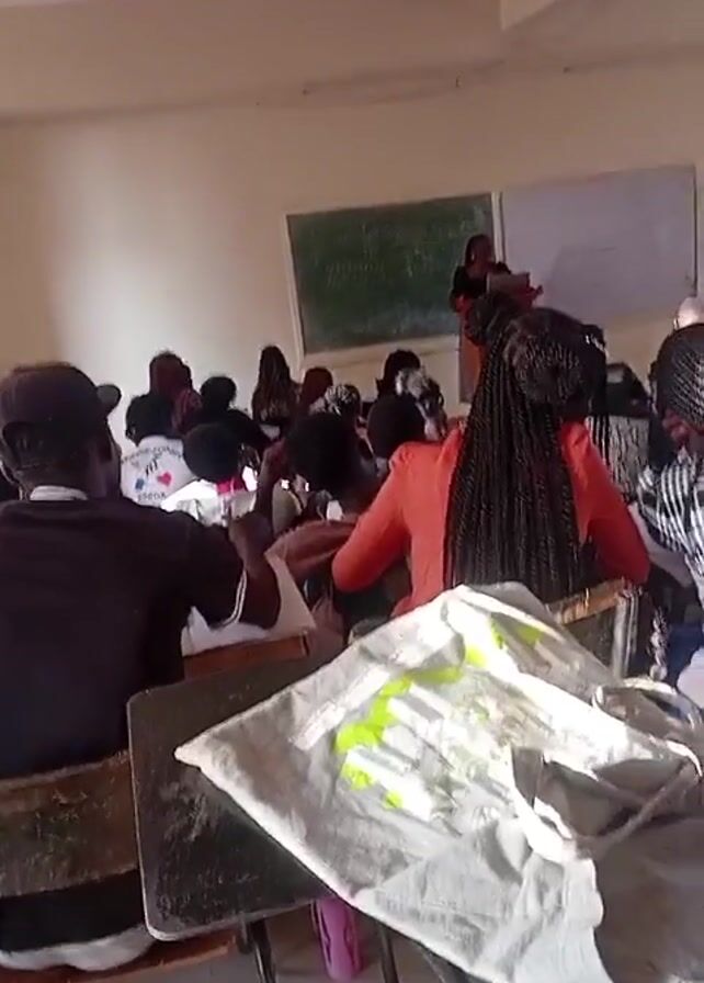 classroom setting with a teacher standing at a lectern facing a group of students seated at desks. The students are mostly seen from the back, and some appear to be taking notes. There is a green chalkboard and a whiteboard behind the teacher, both with writing on them. The classroom is well-lit, and the desks and chairs are a mix of wood and metal. A gray shirt with a green design is lying on a desk in the foreground.