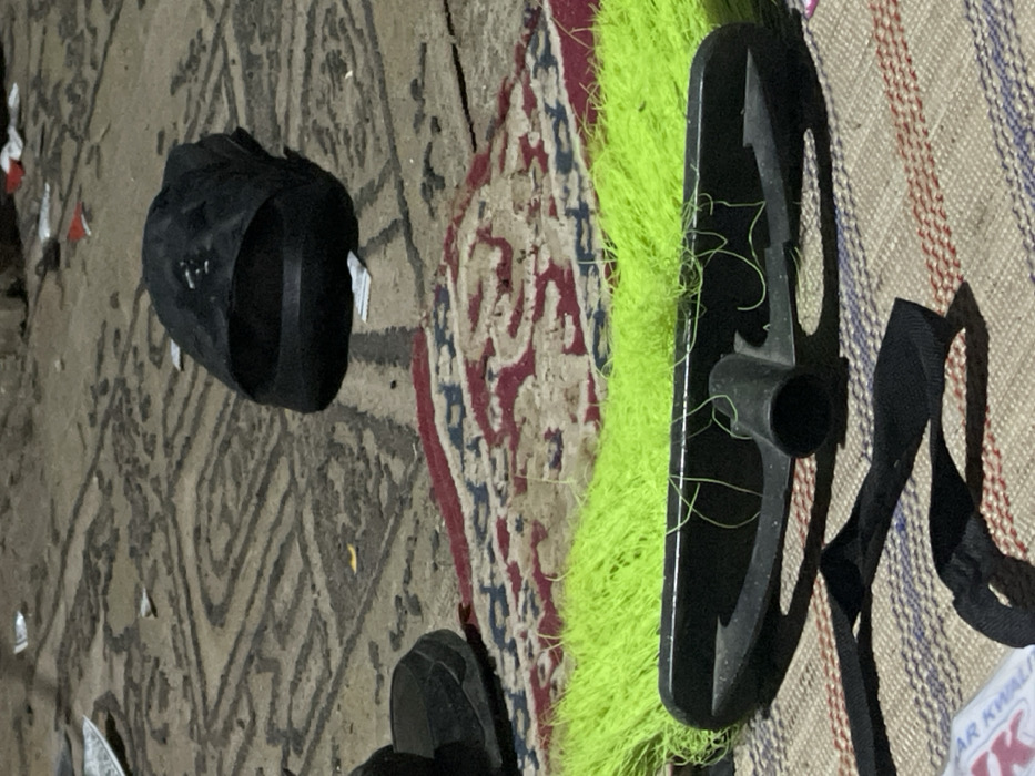 The image depicts an indoor or covered ground-level scene in Kumbang, Indonesia. In the foreground, a black plastic broom head with vibrant neon green bristles lies horizontally on a striped mat or rug, featuring red, blue, and beige patterns. Green string-like debris is tangled within the broom bristles and on the broom head itself. A black fabric strap is positioned to the lower left of the broom head. In the midground, a single black slide-style sandal rests on a beige rug with a darker patterned border. A portion of another black shoe or slipper is visible to the far left. The background reveals a third, lighter-colored mat or rug with a distinct geometric pattern. Small pieces of miscellaneous debris, including what appear to be torn paper or wrappers, are scattered across the floor coverings. No individuals are visible in the scene.
