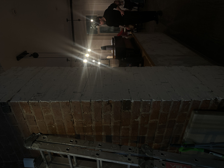 This image depicts the interior of a commercial establishment, likely a cafe or bar, situated in Moscow, Russia. The precise address is not identifiable from the visual content. In the left foreground, a silver-colored, multi-section aluminum ladder is propped against an exposed red brick wall. A blue object is visible resting on the top of the ladder, and a green-handled tool is present near its base. Adjacent to the wall, a prominent structural column features an exposed red brick finish on its left side and a painted white brick finish on its right side. To the right of the column, a long service counter with a light-colored wooden top and a textured, lighter-colored base extends into the background. Equipment on the counter includes a dark commercial coffee machine, a stack of disposable cups, and a clear dispenser. Overhead, multiple ceiling-mounted light fixtures with exposed incandescent bulbs emit strong light, creating prominent star-shaped flares across the image. A male individual stands behind the counter on the right, facing slightly left. He possesses dark hair and a beard, wears a dark long-sleeved shirt, and dark trousers or an apron. A tattoo is visible on his left forearm, and his left hand is placed on his hip. In the blurred background, several indistinct figures, presumed to be patrons, are seated at tables. A window in the far background displays a dark exterior. The scene is illuminated by artificial light, contributing to a generally dim environment with bright localized light sources.