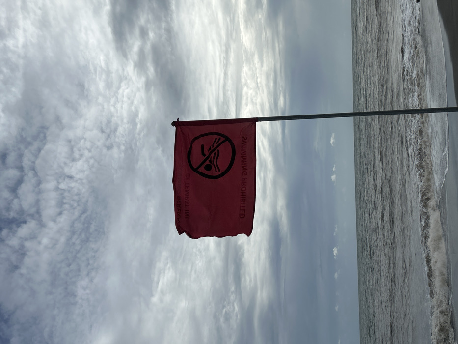 This image depicts a coastal scene under an overcast sky at an unnamed beach in Unknown City, Unknown Country. A red warning flag, attached to a grey metallic pole, dominates the right side of the frame. The flag is partially unfurled and appears to be fluttering in the wind. On its visible side, the flag displays a reversed black "no swimming" symbol (a swimmer with a diagonal line through it) and two lines of reversed text: "SWIMMING PROHIBITED" and "BERENANG DILARANG DI TEMPAT INI" (Indonesian for "Swimming prohibited in this place"). The ocean occupies the middle ground, characterized by dark grey, agitated water with white-capped waves breaking on a dark, wet sand shoreline in the foreground. The sky above is entirely covered with thick, varied grey clouds, providing diffused light. No individuals or man-made structures other than the flag and its pole are visible.