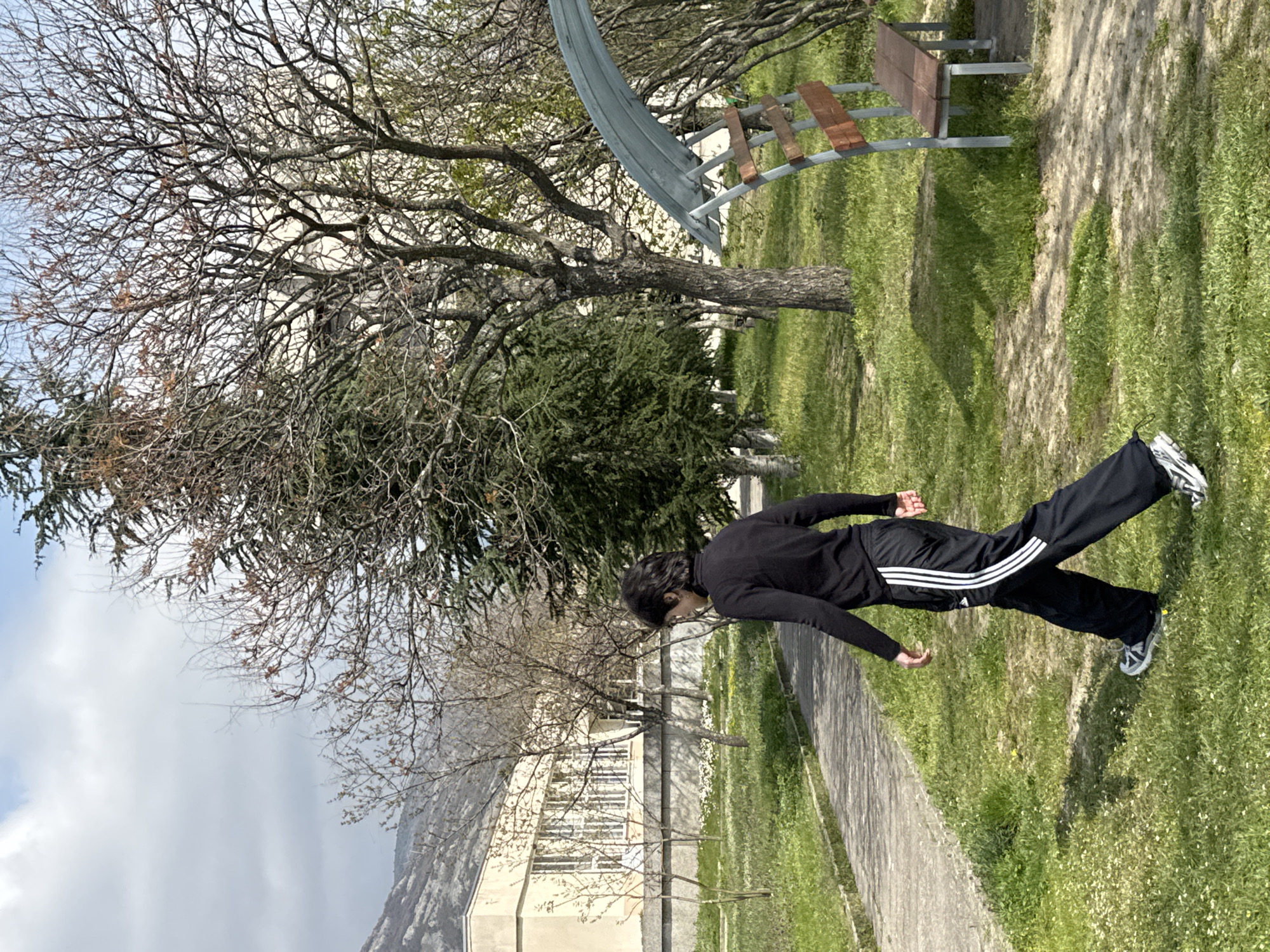 A person is walking along a paved path in a grassy area. The person is wearing black sweatpants with three white stripes down the side and a black long-sleeved shirt. There are trees to the left of the path, some with bare branches and others with green leaves. A building is visible behind the trees, and mountains are in the background under a cloudy sky. To the right of the path, there is a seesaw and a wooden bench. Based on the architectural style of the building and the location of the mountain range, the setting is likely Anevo, Bulgaria.