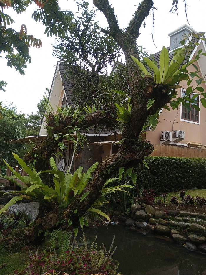 The scene depicts an outdoor residential or garden area in the city of Orehat, India, under an overcast sky. A large, multi-trunked tree with thick, gnarled, moss-covered bark dominates the foreground, extending from the lower left towards the upper right. Numerous Bird's Nest Ferns (Asplenium nidus) and other smaller ferns are growing epiphytically on the tree's branches and trunk. Below the tree, a dark body of still water is present, bordered on the right by a low retaining wall constructed from irregular grey stones. The immediate foreground shows green grass and beds of plants with dark red and green foliage. In the background, a light tan or peach-colored two-story building with a steep A-frame roof and dark grey shingles is visible. A grey chimney stack protrudes from the roof on the right side of the building. Brown-framed windows are visible on the building's facade, and two external air conditioning condenser units are mounted below a window. A dense, trimmed green hedge separates the water feature from the building on the right. Additional green foliage and trees are visible throughout the background. No individuals, animals, or active interactions are present in the frame.