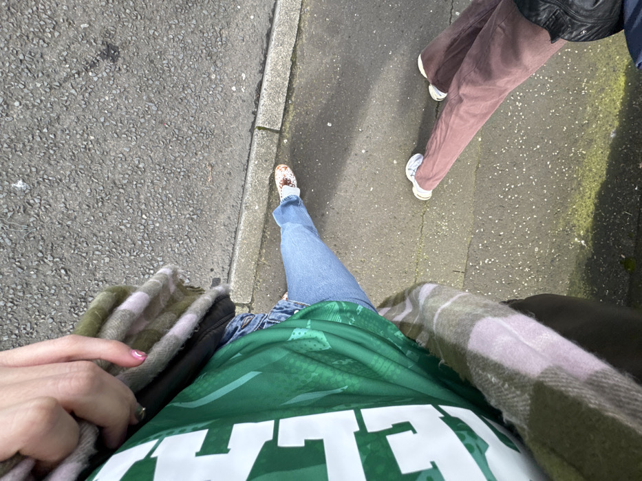 An overhead view captures two individuals standing or walking on a paved outdoor surface in Belfast, United Kingdom. On the left, one person wears a green shirt with white lettering, blue denim jeans, and light-colored shoes with a patterned design. A hand with pink-painted fingernails holds a plaid scarf displaying shades of green and purple. To the right, a second individual wears brown trousers and white sneakers. The ground consists of gray asphalt with scattered small white flecks, bordered by a concrete curb. Shadows are cast across the pavement.