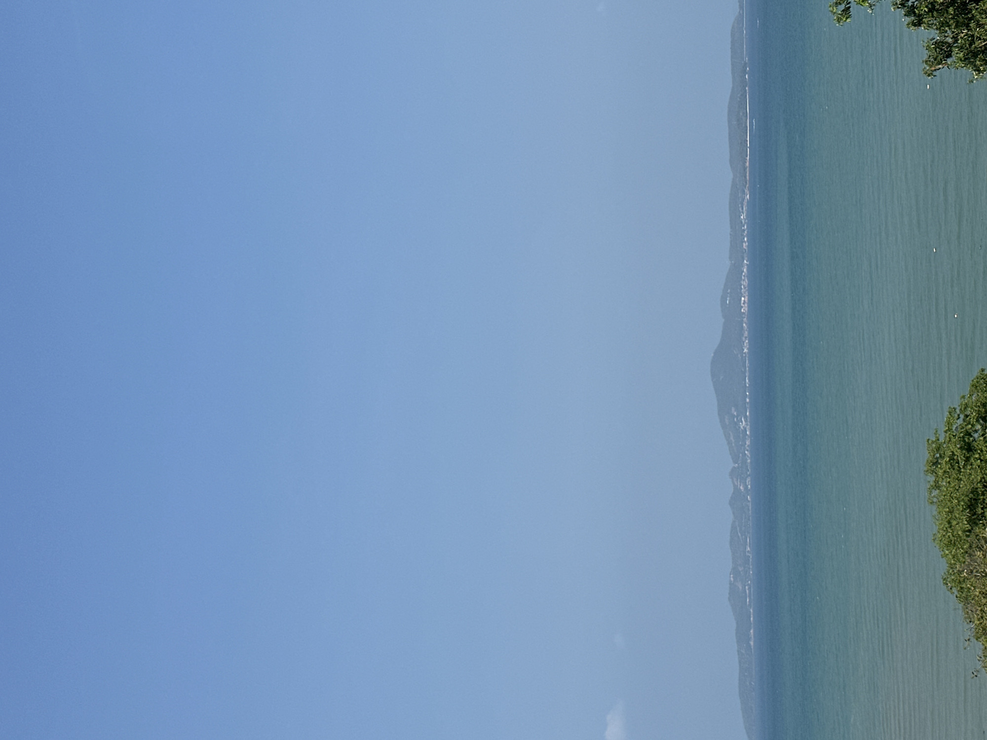 The image depicts a view of the coastline near Pattaya City, Thailand. The sky occupies a large portion of the left side of the image, showing a clear, light blue hue. On the right, the sea stretches into the distance, with a narrow strip of land visible along the horizon. Trees are partially visible in the bottom right corner. The coastline suggests the presence of urban development along the shoreline.