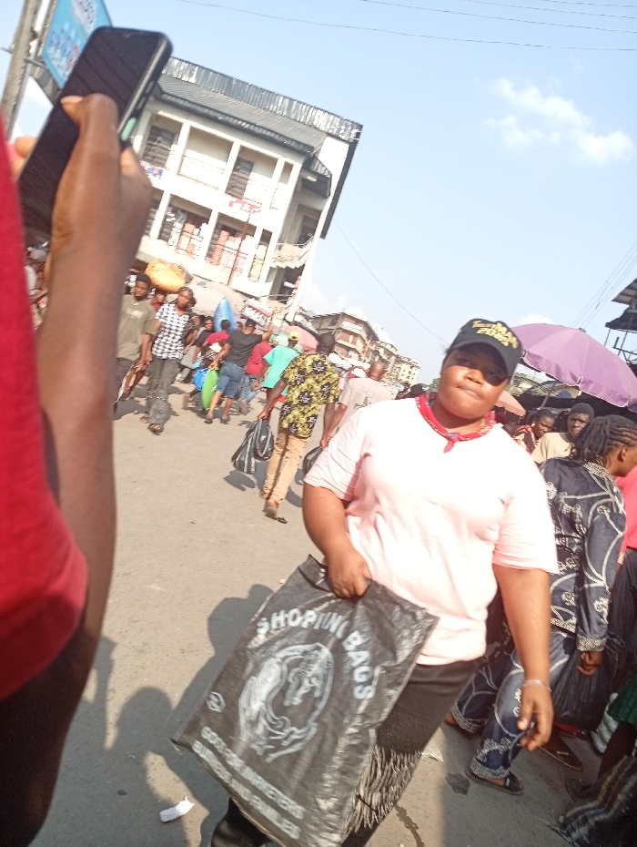 The image captures a bustling outdoor street or market scene in Ogbunike, Nigeria, under a bright, clear daylight sky with sparse white clouds. In the foreground, the right hand of a person, partially obscured by a red garment, holds a black smartphone. The main subject, positioned in the mid-ground and facing the viewer, is a female wearing a light pink short-sleeved t-shirt, a red band around her neck, a black baseball cap with yellow text, and dark bottoms with a fringed detail. She holds a large black "SHOPPING BAGS" branded bag in her left hand, which also displays text such as "GOOD FOR MARKETERS" and "BUSINESS AND FAMILIES," alongside a white logo depicting two stylized figures. A thin silver bracelet is visible on her right forearm. The background is densely populated with numerous individuals walking in various directions, indicative of a busy public space. Several people are visible carrying items, including one person with a yellow sack on their head. Architectural structures, including a multi-story building with white walls and dark roofing, are present in the deeper background. A partial view of an open purple umbrella is seen on the far right. The ground is paved, and the bright sunlight casts distinct shadows on the surface.