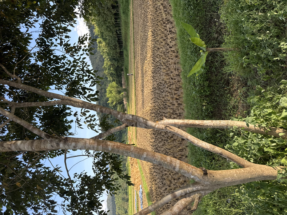 The image presents a rural agricultural landscape in Ban Mae Ping, Thailand. In the foreground, the multi-trunked, light-barked branches and green foliage of a deciduous tree partially frame the scene from the left and center. Directly beneath, dense green undergrowth and grass are visible. To the lower right, a young banana plant with two large green leaves emerges from the ground cover. The midground features an extensive, harvested field characterized by short, uniform brown crop stubble. On the far left of this field, several mounds of lighter brown soil are present, alongside sections of blue tarp or plastic sheeting. A single individual, wearing light-colored clothing and a wide-brimmed hat, is observed walking from left to right across the mid-right portion of the harvested field. The background reveals a distinct line of uniformly spaced, slender-trunked trees forming a boundary along the field's right edge. Beyond these trees, a series of green, forested hills and mountains rise against a clear blue sky with minimal white clouds. The scene is illuminated by natural light, suggesting late afternoon sun.