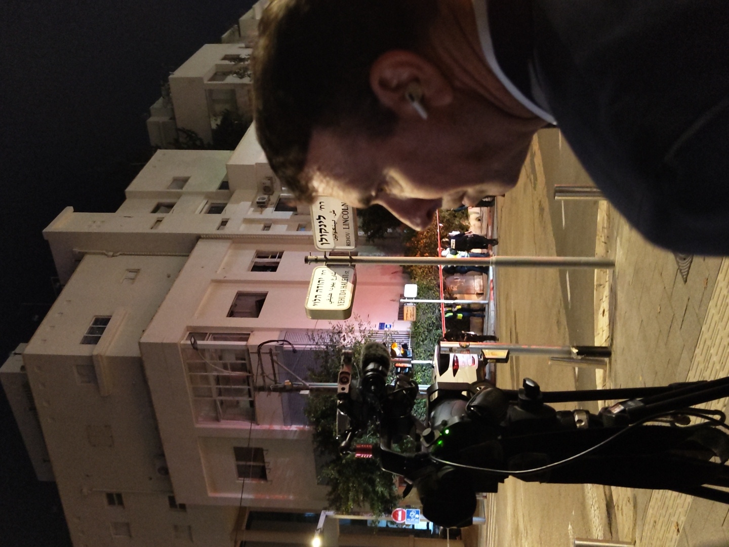 At night, an urban scene is depicted at the intersection of Lincoln Street (Rehov Lincoln) and Yehuda Halevi Street (Yehuda Halevi St) in Tel-Aviv, Israel. In the immediate foreground, the right profile of a male individual is visible. He has short brown hair, wears a dark suit jacket, and has a white wireless earbud in his right ear, facing towards the midground. To his left, a professional black video camera on a black tripod is positioned, facing the same direction, with a green indicator light illuminated on its body and a microphone attachment. In the midground, a street is cordoned off by red barrier tape, behind which multiple uniformed individuals, including at least one in a yellow reflective vest and one in a dark police-style uniform, are present. A white vehicle is partially visible behind the tape. Street signs clearly display "REHOV LINCOLN" and "YEHUDA HALEVI St" in both Hebrew and English. The background features a multi-story, light-colored building with numerous windows and balconies, illuminated by artificial light against a dark night sky. The overall scene suggests media presence at an official incident or crime scene.