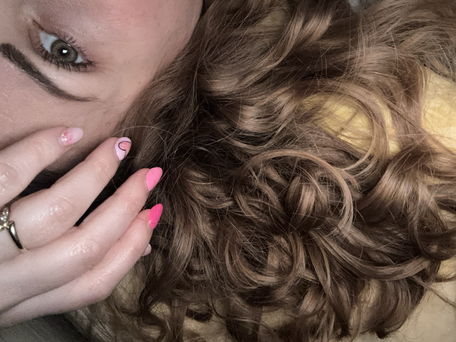 The image presents a close-up, angled view of a human subject. The upper right quadrant shows a partial light-skinned face, specifically the right eye with a dark iris and visible eyelashes, beneath a groomed eyebrow. A light-skinned hand rests on a voluminous mass of wavy, medium-brown hair that occupies the lower and left portions of the frame. The hand displays manicured fingernails; the index and middle fingers are painted solid bright pink, the ring finger features light pink polish with a black heart outline, and the pinky finger has light pink polish with glitter. A gold-toned ring, set with a clear or light-colored stone, is visible on the ring finger. The hair appears to be resting on a light yellow or tan fabric surface, indicating an indoor environment. No specific features within the image allow for the determination of a precise location in Aidemir, Bulgaria.
