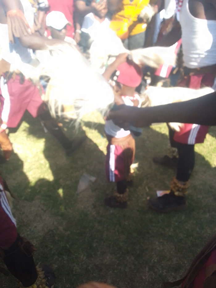 An outdoor scene is depicted on a sunny day with distinct shadows cast on short green grass. In the center, a young child, estimated to be a toddler, stands facing forward, wearing a red cap, a white sleeveless top, maroon shorts with white vertical stripes, dark leggings, and dark shoes with prominent light-colored, possibly decorative, ankle adornments. A dark-skinned arm extends from the right foreground, positioning a hand near the child's right arm or torso. To the child's immediate right, an adult or older youth is partially visible, wearing a white sleeveless top, maroon shorts with white stripes, dark leggings, and dark shoes with similar light-colored ankle adornments. Behind the child and slightly to the left, a person is largely obscured by a voluminous, bright white garment that appears fibrous or feathered, extending downwards and partially engulfing the child's upper body. The lower legs of this central bright figure are visible, clad in dark attire. To the far left, another individual is partially visible, wearing maroon shorts with white stripes and dark leggings, with an arm raised. In the blurred background, several other individuals are present, including one wearing a white baseball cap and another in a yellow shirt. Small pieces of light-colored debris are visible on the grass. The location is an unspecified outdoor area in Unknown, Unknown.