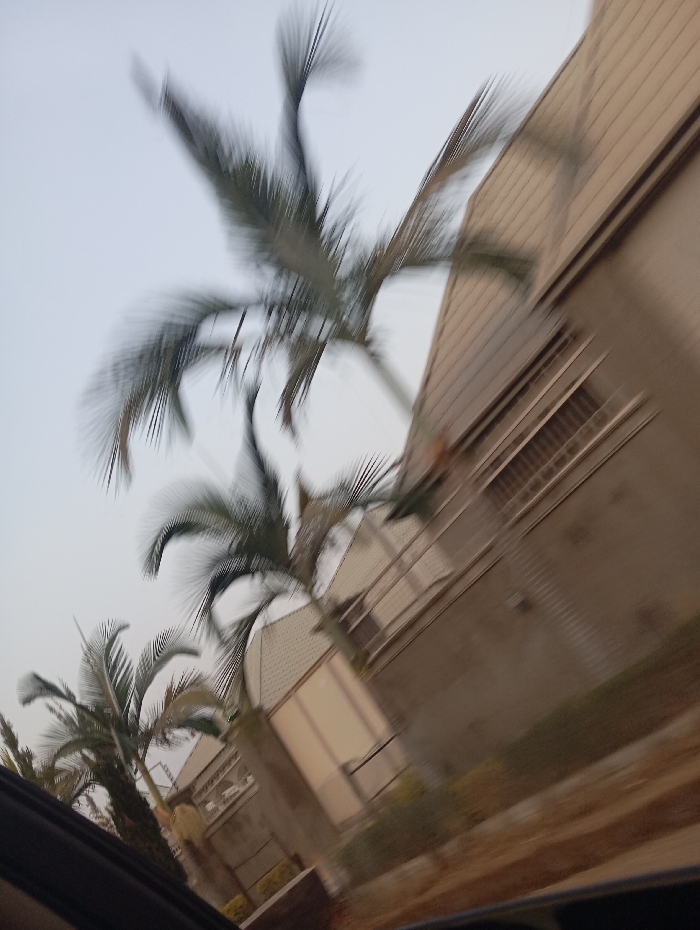 The image captures a blurred view of palm trees lining a street, juxtaposed with a building. The structures have a beige color. A fence is also visible. The photo gives a sense of movement, possibly taken from a moving car. The sky is overcast.