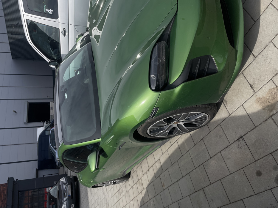 - "A bright green Porsche Taycan electric sports car is parked on a light gray paver-tiled surface under direct daylight" by FM-KIPqC3, licensed under CC BY 4.0