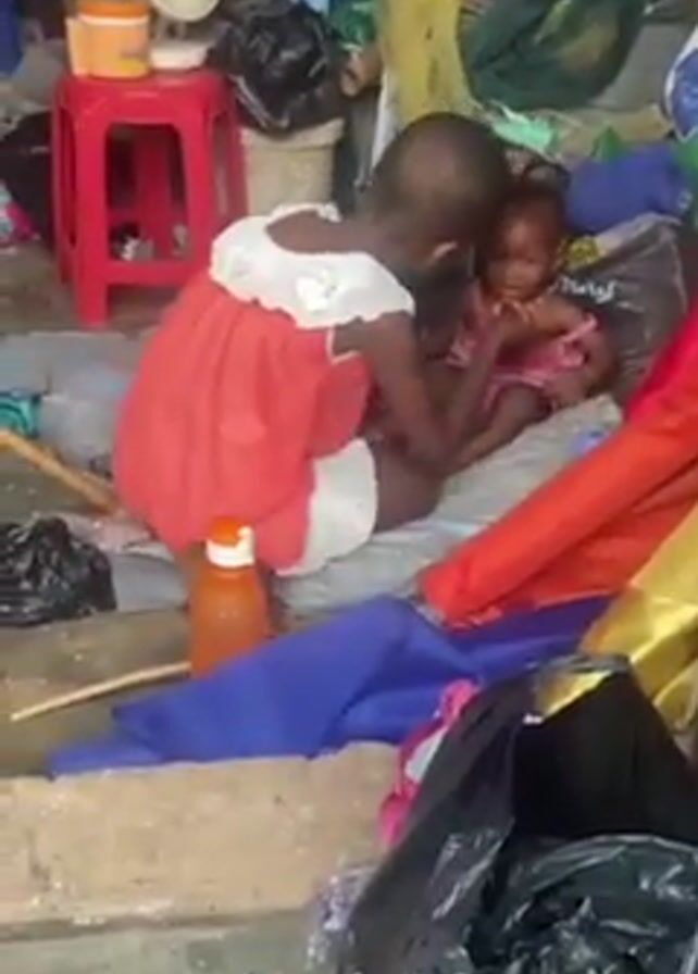 A young girl wearing a red and white dress sits on the floor and attends to a baby dressed in pink. They are surrounded by piles of fabric, plastic bags, a water bottle, and other items. The environment appears cluttered and cramped. The girl seems to be feeding or caring for the baby.