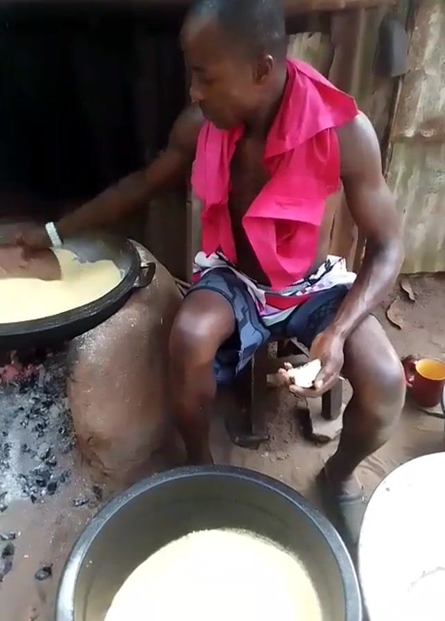 A man with short dark hair, wearing patterned shorts, a pink shirt draped around his neck, and sandals is seated on a small wooden stool, stirring the contents of a large black wok-like pan. The pan is perched on a makeshift stove built from clay or earth, with a fire burning underneath. The contents of the pan appear to be a light tan color. In the foreground, there is a black plastic tub filled with the same light tan substance. Another white tub is partially visible to the right. The man is holding a small white lump in his hand. He is looking down and concentrating on the pan as he stirs. The setting appears to be outdoors or in a simple structure with corrugated metal walls visible.