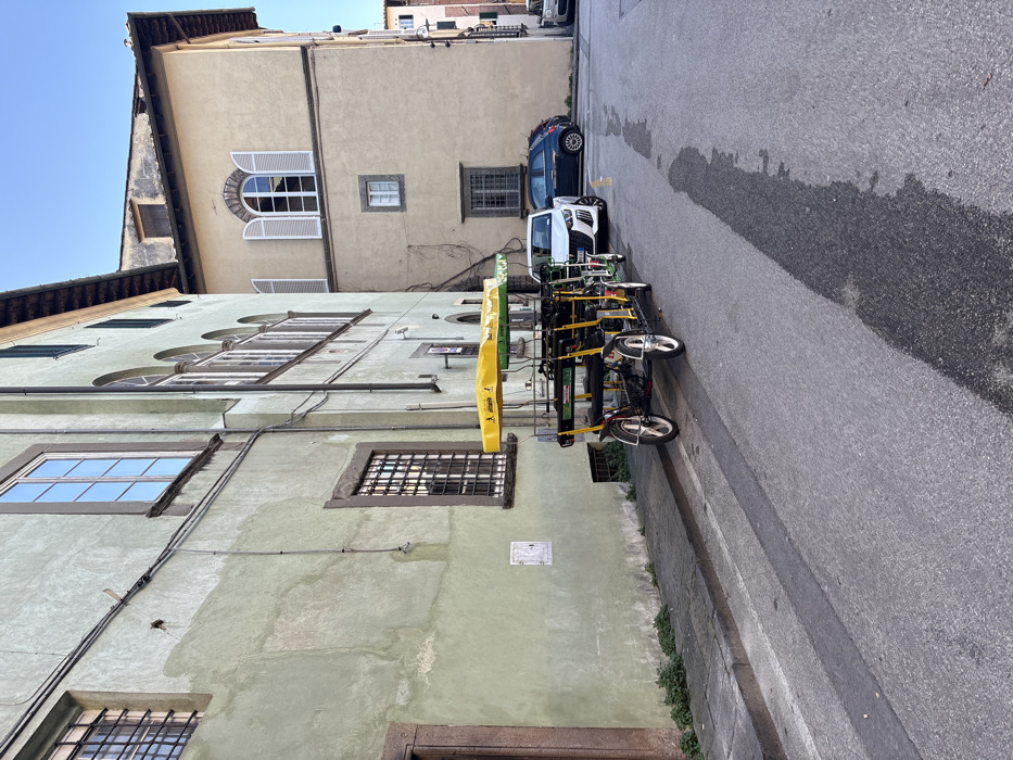 The scene depicts a paved street in Lucca, Italy, bordered by multi-story buildings under a clear blue sky. On the left, a light olive-green building with a worn plastered facade features several windows, some with grilles and others reflecting the sky. Electrical conduits are visible on its exterior. Adjacent to this building, a stone sidewalk runs parallel to the street. Two unoccupied, yellow-framed multi-person pedal vehicles, each equipped with a yellow canopy, are parked in sequence along the curb. Beyond these, a white modern hatchback, followed by a dark blue compact car, are parked facing away from the viewer. On the right, a light beige building with multiple windows, including an arched one with white open shutters, stands further back. The asphalt road surface exhibits a long, distinct shadow stretching across its width. No individuals are present in the frame.