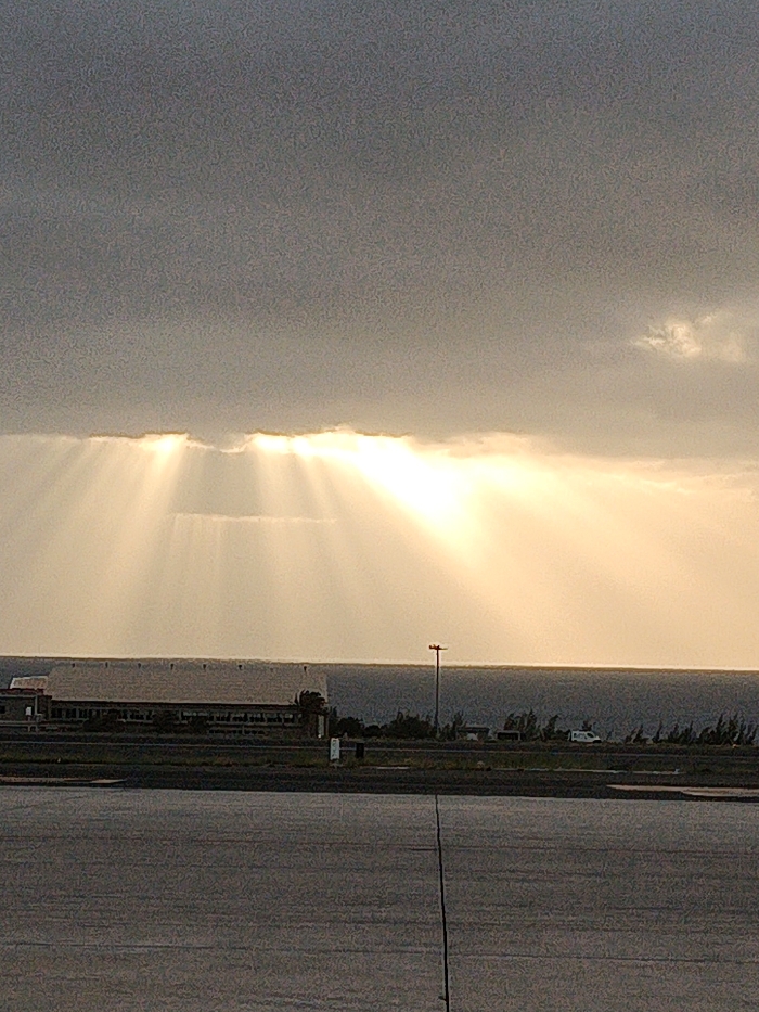 The image depicts a twilight scene over an area in Ingenio, Spain, likely near Gran Canaria Airport, with the Atlantic Ocean in the background. The upper portion of the sky is dominated by dark grey, overcast clouds. A horizontal band of bright, golden-yellow light cuts across the mid-sky, originating from a break in the cloud cover, from which prominent crepuscular rays descend diagonally downwards and to the right. Below the horizon, a dark blue expanse of the ocean is visible. In the foreground, a dark grey paved surface, resembling an airfield tarmac or runway, occupies the bottom half of the image. A dark linear marking extends vertically from the bottom center of the frame across this paved area. Between the foreground pavement and the ocean, an elongated, multi-story building with a light-colored roof and dark window bands is situated on the left. To the right of this building, a tall, dark vertical pole with a horizontal top bar stands. A narrow strip of dark green, wind-swept vegetation lines the edge of the landmass before the ocean. A small, light-colored vehicle is faintly visible amidst this vegetation on the right. No individuals or specific actions are discernible.