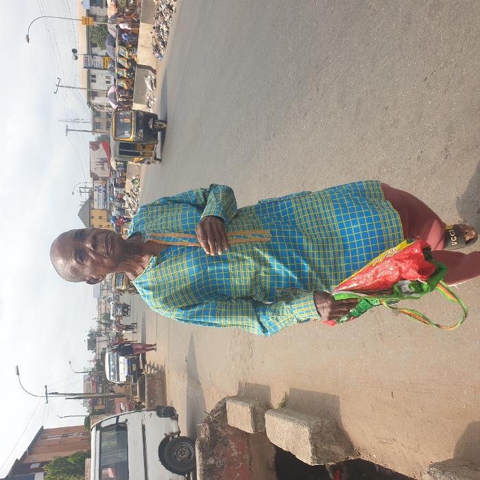 An elderly, bald man with a dark complexion walks along a concrete path in Onitsha, Nigeria