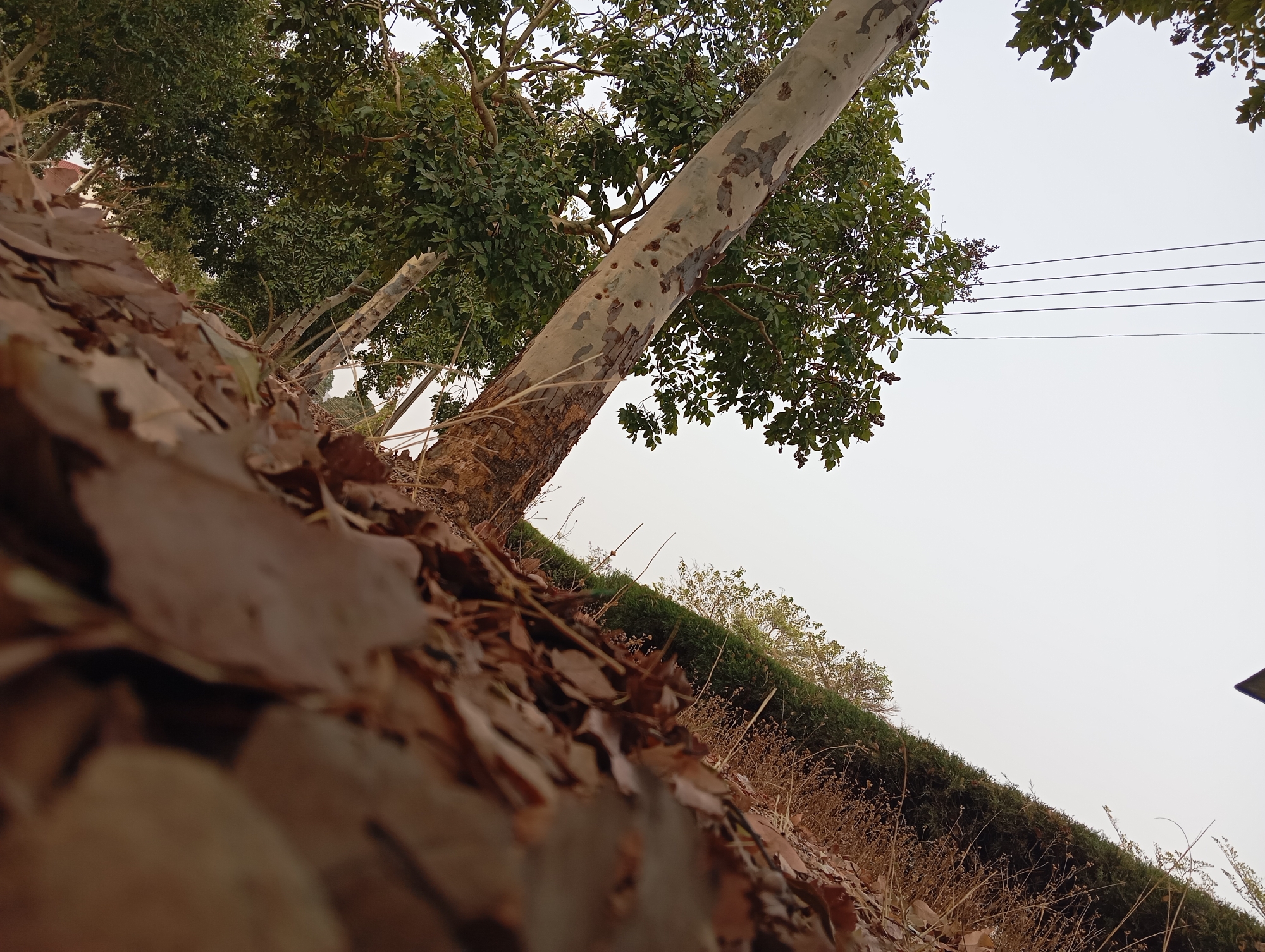 A low-angle view captures an outdoor scene in Barikin Ladi, Nigeria. The immediate foreground, occupying the lower-left, is covered by a dense, blurred layer of dry, brown deciduous leaves and twigs. A large tree trunk, likely eucalyptus, rises diagonally from the lower-left towards the upper-right, featuring distinct light grey, mottled bark that peels in irregular patches, revealing darker brown underbark. Its upper branches, bearing dense green foliage, extend towards the upper-left and right. In the mid-ground, a dark green, dense hedge or embankment runs horizontally from left to right, with dry, light brown grasses and sparse vegetation situated below it. The upper-right portion of the image is dominated by a pale, overcast sky, against which four parallel power lines or communication cables are visible horizontally. No individuals or discernible actions are present.