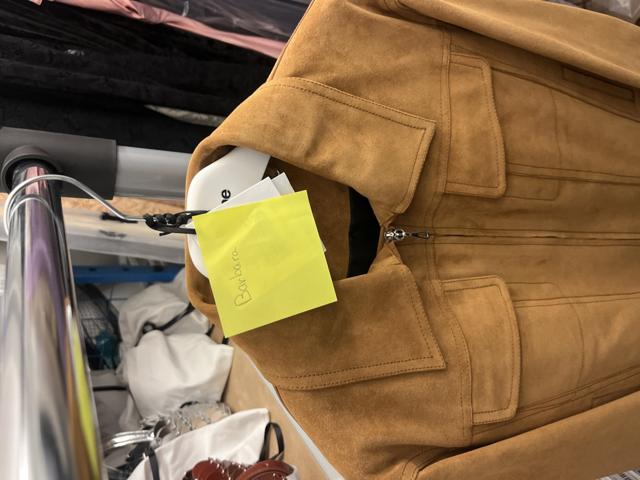 A brown suede jacket hangs on a rack. A yellow sticky note with "Barbara" written on it is attached to the hanger. The jacket is zipped up and has visible stitching details around the collar and pockets. The rack is metal and holds other clothing items in the background. White bags or clothing items are also visible beneath the rack, adding to the cluttered storage area.