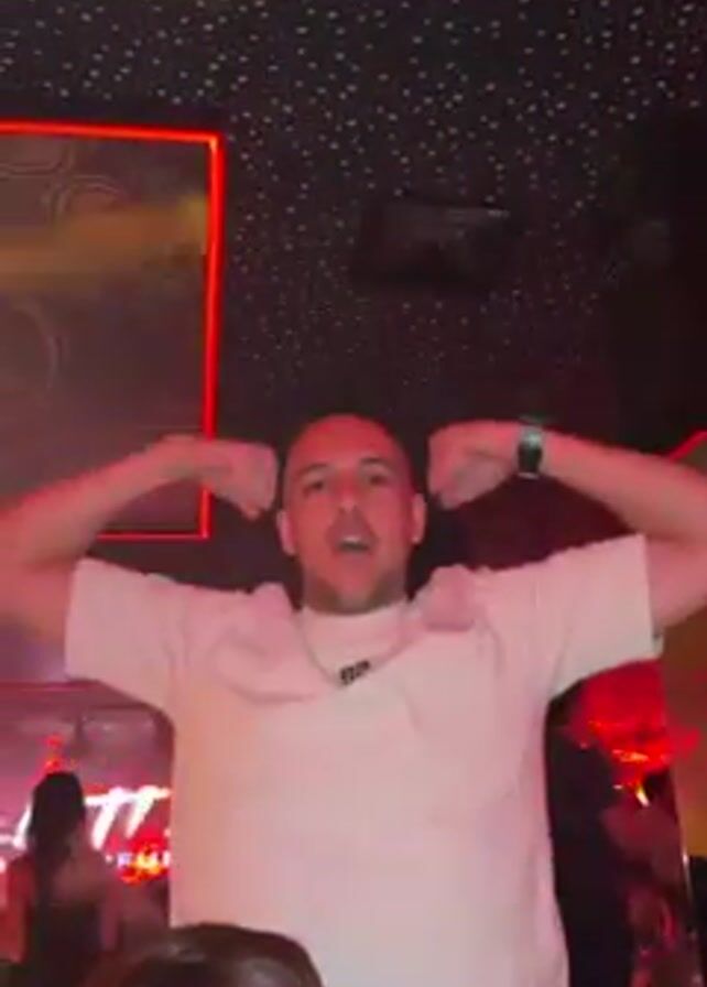 A man in a white t-shirt dances with his arms raised in a crowded nightclub