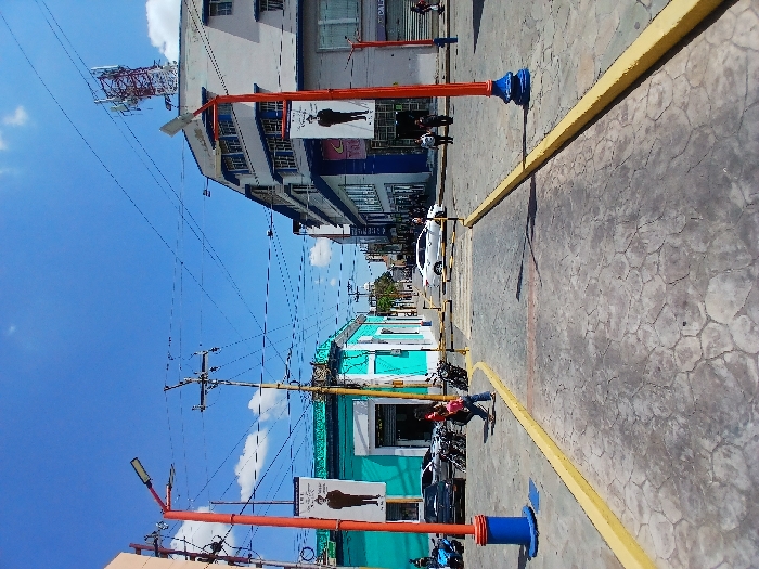 A street scene is captured at an oblique angle under a blue sky with scattered clouds. Tall buildings line the street with power lines and a communication tower overhead. Orange posts with blue bases flank the sides, displaying advertisements. Vehicles and people populate the sidewalks, adding to the street's activity. The road surface shows a textured pattern with yellow painted lines marking the curbside.