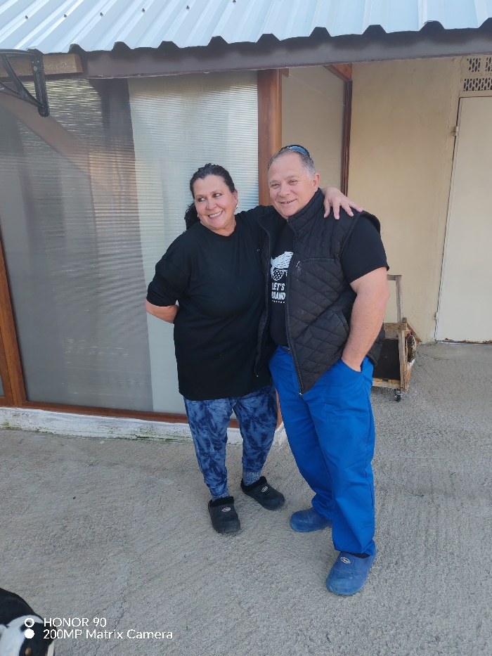 The image displays two adults, a female and a male, standing outdoors on a light gray concrete surface in the city of Rosen, Bulgaria