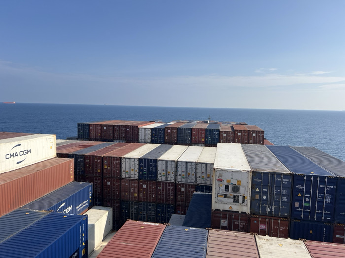 The image depicts a forensic view of a vast number of shipping containers stacked on the deck of a large container ship at sea, under a clear, light blue sky