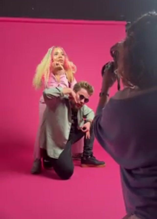 A photographer is taking a photo of a man and a woman in front of a hot pink backdrop. The man is kneeling, with his right hand over his left eye and his left hand in front of his mouth. He is wearing sunglasses, a long-sleeved shirt, and black pants and sneakers. The woman is standing behind him, with her left arm around his shoulders. She is holding two fingers to her lips and has light pink and yellow hair with streaks of pink braid. She is wearing a light pink shirt and pants and grey sneakers. The photographer is wearing a light purple sweater and white pants. The photograph is being taken in a studio.