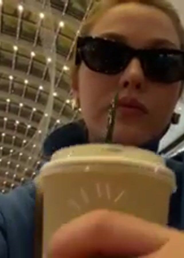 A woman wearing sunglasses and a blue sweater is drinking from a takeout cup with a straw in it. The cup has a simple white sun-like design. She is indoors in what appears to be a shopping mall. The ceiling is high with a modern grid pattern and small lights. She takes a sip and looks directly at the camera.