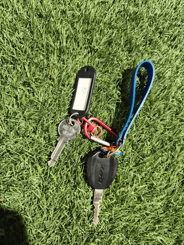 A key assembly is depicted lying stationary on a patch of short, vibrant green grass, brightly illuminated by direct sunlight, which casts distinct shadows