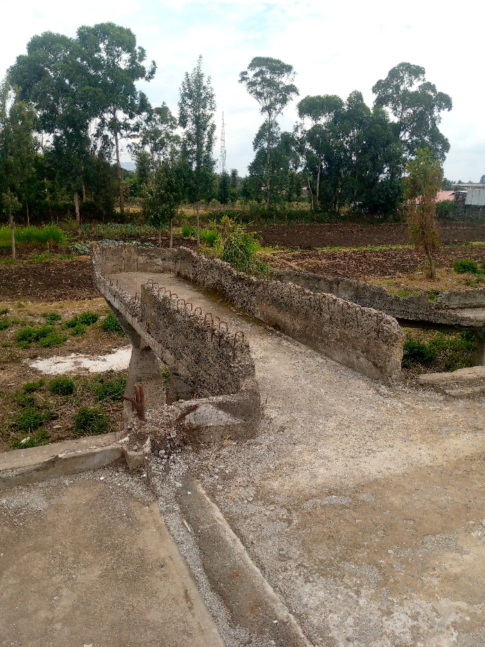 The image displays a dilapidated concrete pedestrian bridge or culvert located in a semi-rural setting within the city of Unknown, Unknown