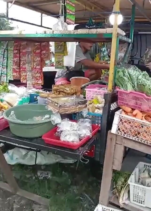 n outdoor market stall selling various food items. The stall is covered by a roof and lit by two bare light bulbs. A man is behind the stall, apparently attending to a customer. The stall is filled with produce, including leafy green vegetables, carrots, potatoes, and packaged goods. A customer wearing a yellow helmet, light brown hijab, yellow shirt, and jeans stands at the stall, likely paying for goods. Another woman in a red hijab and brown pants stands behind the first customer, possibly waiting to be served. The ground around the stall is a mix of dirt and gravel. The overall scene is typical of a local market where people buy fresh produce and other food items.