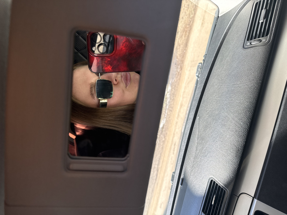The image depicts the interior of a vehicle, specifically focusing on the passenger-side vanity mirror and the dashboard. A young woman with light brown hair and rectangular, gold-framed sunglasses is reflected in the vanity mirror, actively taking a selfie with a red, reflective smartphone featuring a multi-lens camera system. Her lips are pursed. The dashboard below the mirror is dark gray with a textured finish, displaying air vents on both the left and right sides, and a horizontal silver trim piece. Through the vehicle's windshield, a light-colored, indistinct outdoor environment, possibly snow-covered ground or a dirt road, is visible under natural light. The precise location within the city of Chaikovsky, Russia, cannot be determined from the visual information provided in the image.