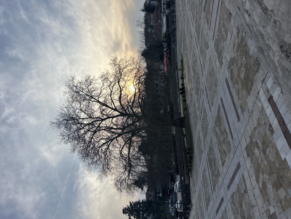 The image captures a wide-angle view of a public square in Kalofer, Bulgaria, at a time of day when the sun is low on the horizon. The sky is partially overcast, exhibiting a gradient from pale blue-grey in the upper regions to a bright yellowish-orange near the horizon on the right, where the sun is partially obscured by tree branches. A faint white contrail is visible in the upper-left quadrant of the sky. A large, bare deciduous tree, likely a sycamore, stands centrally in the mid-ground, its extensive network of leafless branches silhouetted against the bright sky. The tree is situated within a small, low-walled planter area. The foreground is occupied by a sprawling paved plaza constructed from light-toned square and rectangular tiles arranged in a geometric pattern, interspersed with darker, contrasting rectangular elements. The paving exhibits variations in color and texture. In the mid-ground, to the right of the tree's base, two individuals are seated on a low wall or bench, appearing as dark silhouettes. A bicycle stands upright near them. A dark, low barrier runs horizontally across the scene, separating the plaza from a lower area beyond. Further back, on the left, a street is visible with several parked or moving vehicles, including a light-colored sedan. The background features scattered vegetation, including evergreen conifers on the far left and additional bare trees, along with low-rise buildings characterized by red-tiled roofs, indicating an urban settlement.