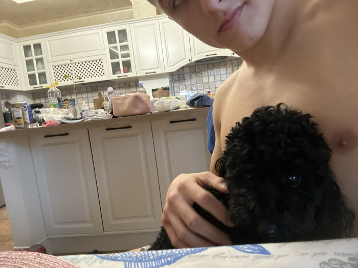 The scene is an interior view of a kitchen located in Burgas, Bulgaria. A shirtless individual is partially visible on the right side of the frame, from the upper chest upwards, with the face cropped above the mouth. The individual's right arm is positioned to support a small, black, curly-haired dog, whose head is oriented towards the viewer. The background features white upper and lower kitchen cabinets with black handles; some upper cabinets incorporate glass panels and decorative white latticework. A light-colored countertop sits above the lower cabinets, backed by a patterned tiled backsplash. The countertop is populated with numerous items, including a large clear plastic bottle, a yellow citrus fruit next to a stemmed plant in a clear vase, a pink cosmetic pouch, a gold-colored coffee container, and other miscellaneous household objects. The immediate foreground displays a white surface with blue patterns, identified as a tablecloth, and a partial view of a pinkish-red woven mat on the left.