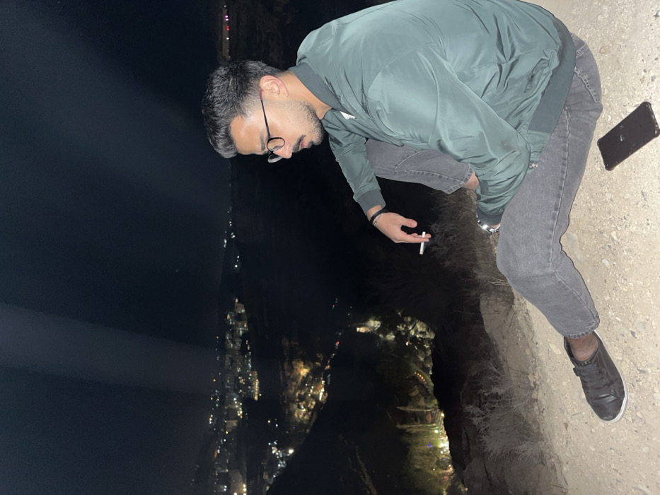 - "A male subject is seated on dry, light-colored soil at night, positioned on an elevated overlook within Dummar Municipality, Syria, with an urban landscape visible below" by FM-WnN6r1, licensed under CC BY 4.0